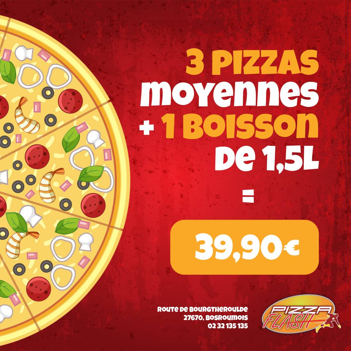 Promotion n° 4 : 3 Moyennes pizzas et 1 boisson de 1,5 l pour 39,90 € !